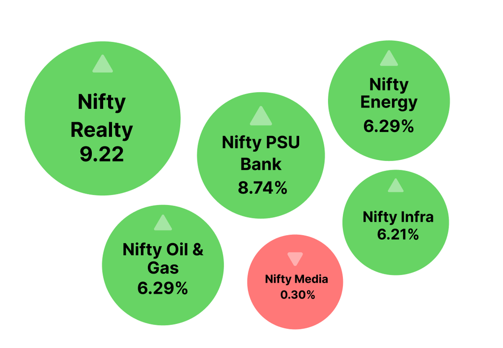 | Why? Realty and Infra stocks gained amid the festive season and hopes of an interest rate cut. State-owned Oil & Gas and Energy companies reported stellar results, and the Cabinet approved a ₹30,000 crore compensation package to oil marketing companies for losses in Domestic LPG. PSU Banks rose on speculation that the government might raise the FII cap in PSUs from 20% to 49%. In contrast, Media fell on disappointing Q2 results. |