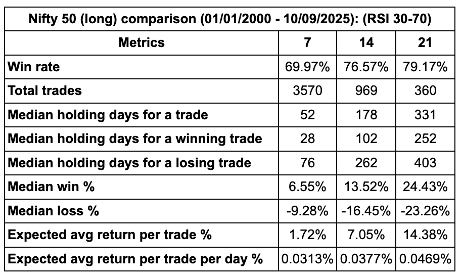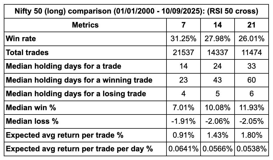 For RSI 50 Cross, a 7-period RSI gave the best daily returns, thanks to faster signal generation and shorter holding periods. This suits traders seeking more frequent opportunities.