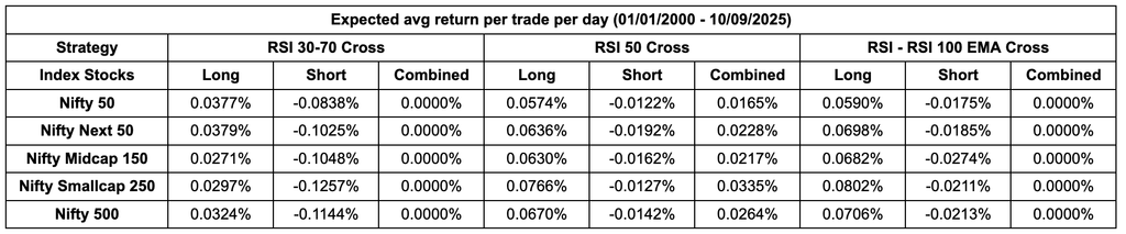 Long-only trades worked. Short-only and combined strategies didn’t. - Short strategies consistently generated losses across indices. RSI, it turns out, is better at identifying bullish setups in Indian markets.