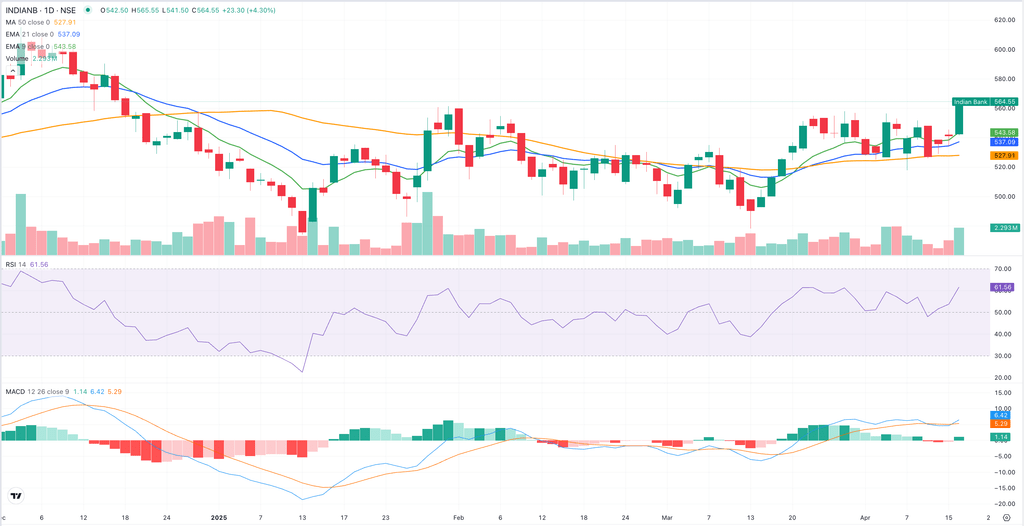 Indian Bank (CMP: ₹564), a prominent public sector lender, surged 4% by 01:00 PM today, supported by increased trading volume and strong technical signals. The stock is currently trading above its 10-day, 21-day, and 50-day moving averages, indicating sustained strength. Momentum indicators such as the MACD (Moving Average Convergence Divergence) and RSI (Relative Strength Index) are also flashing bullish cues.