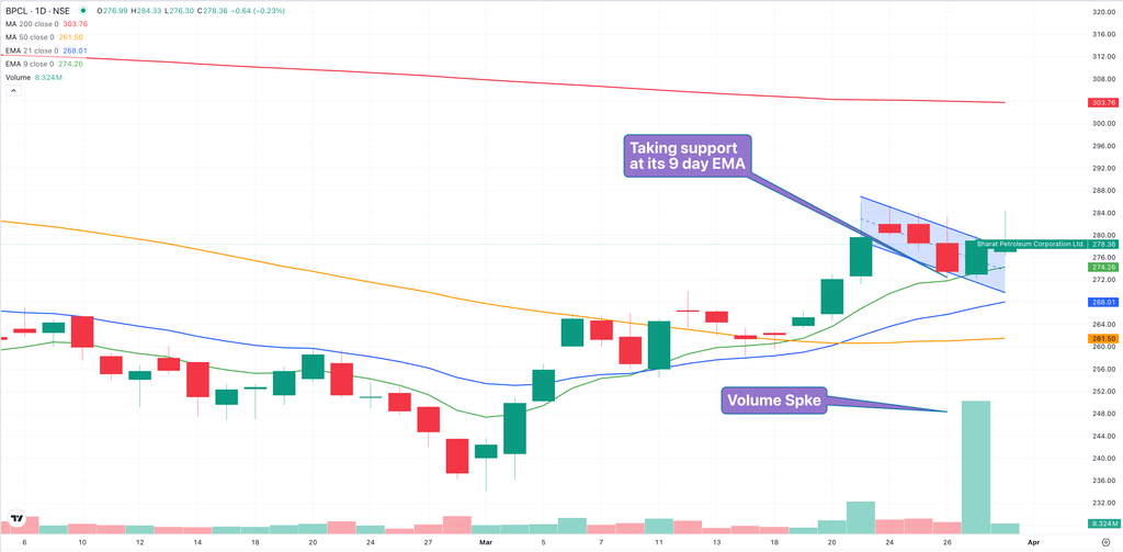 Bharat Petroleum Corporation Ltd (BPCL), a key player in crude oil refining and petroleum marketing, is approaching a channel breakout. A notable volume spike and its position above the 50-day moving average indicate an uptrend, signaling further potential upside if momentum sustains.