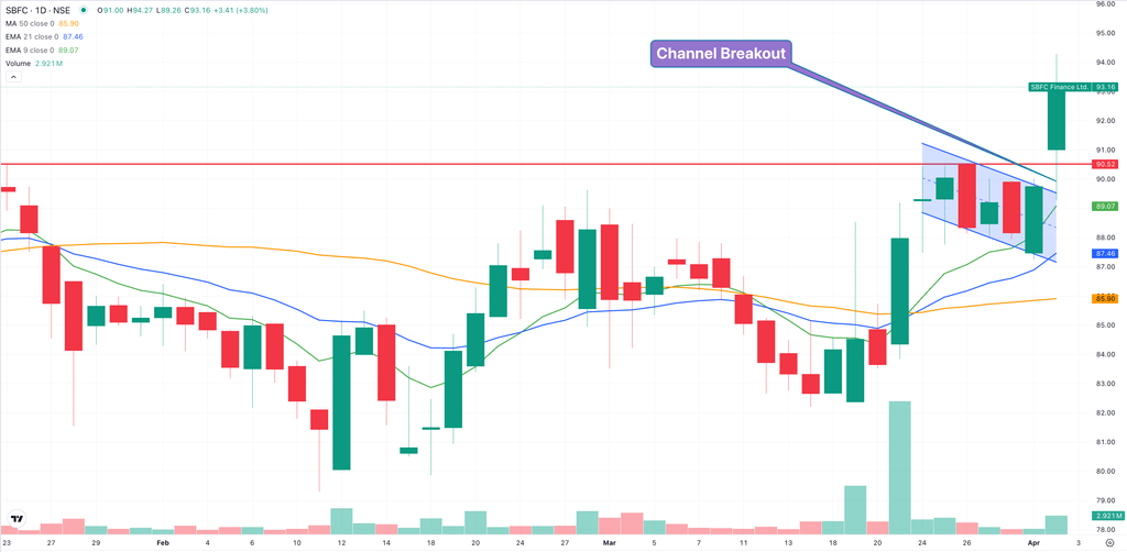 SBFC Finance Ltd., which provides loans to micro-enterprises secured by residential or commercial property, as well as gold loans, unsecured personal loans, and business loans, has seen its stock surge by 3% today. The stock has broken out of its channel, with the 10-day and 21-day moving averages trending upward, signaling potential strength. Additionally, trading above its 50-day moving average confirms the uptrend. Investors will be closely watching its performance in the coming sessions.