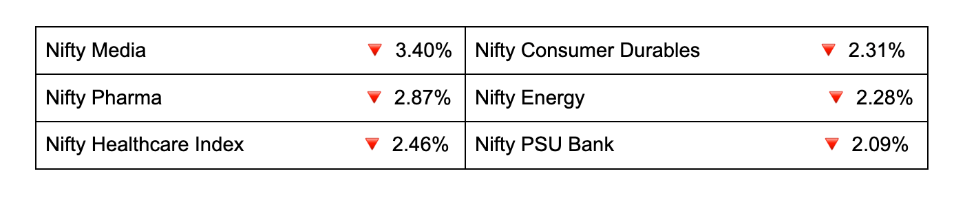 The Sensex fell by 199.76 points, while the Nifty slipped 102.15 points. Nifty Media led sectoral losses, down 3.40%. Among stocks, Godfrey Phillips India soared 20%, while Concord Biotech tumbled 19.86%, the biggest loser.