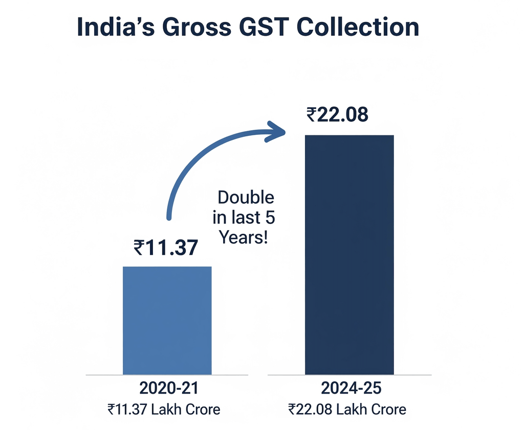 In 2024–25, GST recorded its highest-ever gross collection of ₹22.08 lakh crore, reflecting a year-on-year growth of 9.4 percent. The average monthly collection stood at ₹1.84 lakh crore.