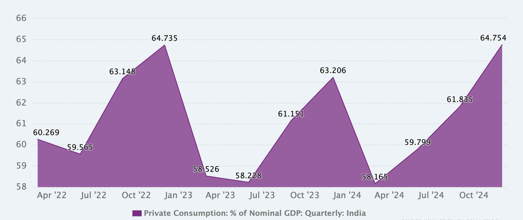 Here’s what makes this particularly powerful – India’s private consumption now represents 64.8% of Nominal GDP, n Dec 2024, compared with a ratio of 61.8 % in the previous quarter.