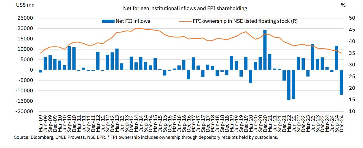 A few months ago, foreign investors were pumping money into Indian stocks. But by late 2024, things changed. Worried about high prices, slower growth, and U.S. rate cuts, they pulled out $11.9 billion – the biggest exit in 10 quarters.