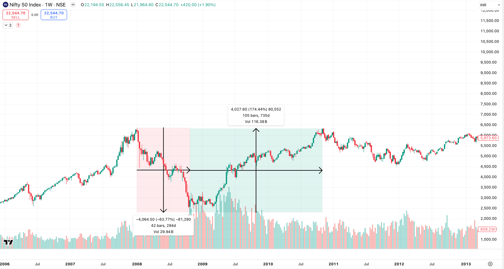 India wasn’t at the center of the storm, but FIIs pulled out big time, and Nifty fell by 63% in just 11 months. The market hit rock bottom in March 2009.