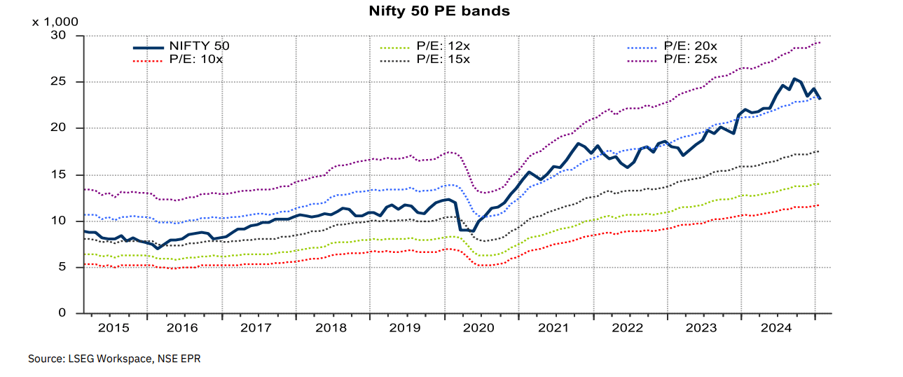 Lower P/E (around 12x) signals undervaluation, while anything above 20x suggests a premium. Post-2020, confidence kept Nifty’s P/E above its long-term average of 16.4x, and in 2024, it’s hovering near 20x – higher than historical norms.