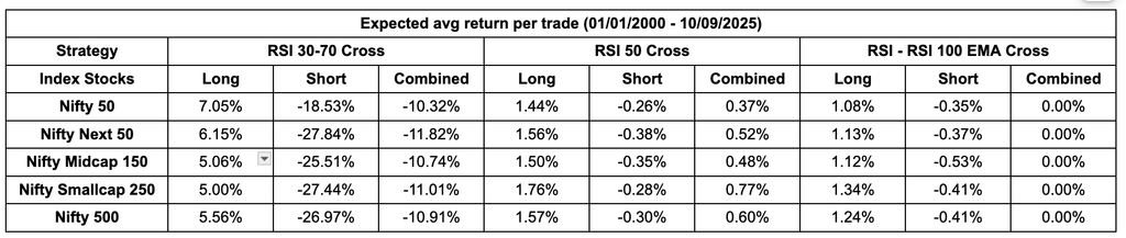 Long-only trades worked. Short-only and combined strategies didn’t. - Short strategies consistently generated losses across indices. RSI, it turns out, is better at identifying bullish setups in Indian markets.