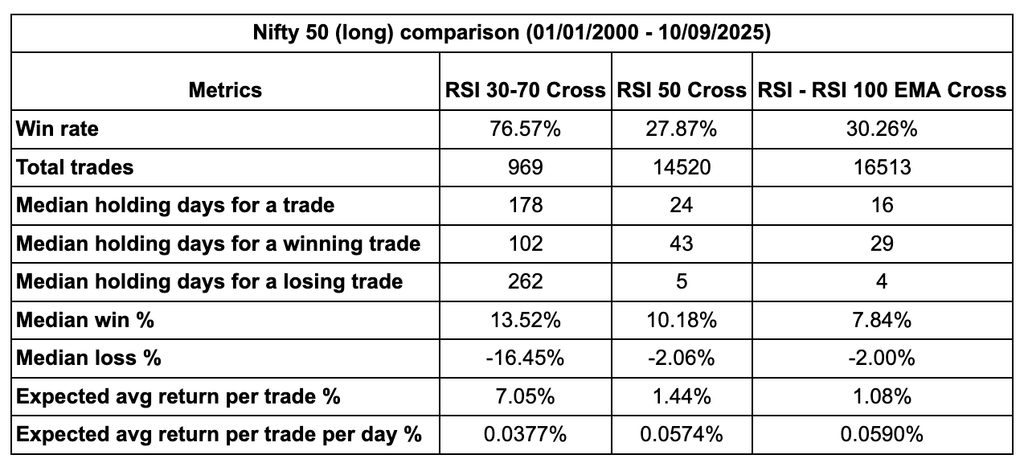 For RSI 50 Cross, a 7-period RSI gave the best daily returns, thanks to faster signal generation and shorter holding periods. This suits traders seeking more frequent opportunities.
