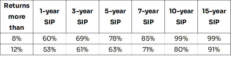 We looked at 1-year, 3-year, 5-year, 7-year, 10-year and 15-year rolling returns of SIPs and tried to find the probability of how likely it is that you would have made more than 8% and 12% in the past. Here’s what we found: