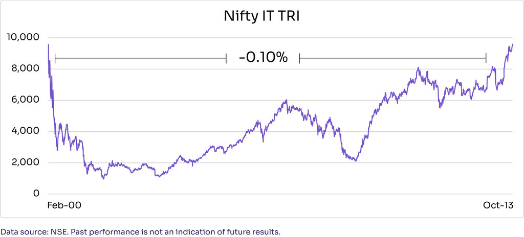 As you can see in the above charts, investments made in some of the sectors and themes that were “trending” at the time of investment have ended up underperforming for a prolonged period of time. Infrastructure was the most talked about theme in 2007-08, but the data suggests that it was one of the worst-performing themes for the next decade or so, with the Nifty Infrastructure Index taking more than a decade to recover to its 2007-08 levels. A similar behaviour was noticed in IT stocks when there was massive hype around this sector in 1999-2000.