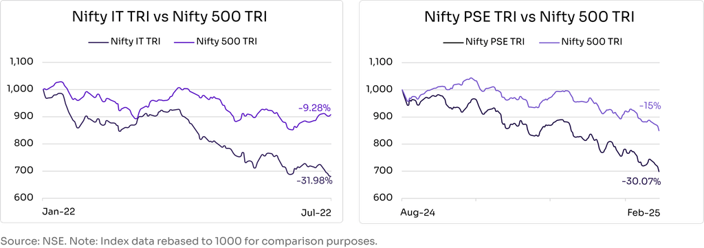 And if investors enter such funds at the wrong time, the consequences can be severe. For example, IT sector funds were in demand in 2021 due to its stellar performance, but in the first few months of 2022, the sector was down almost 32% vs a fall of 9% for the broader index Nifty 500. A similar trend was observed in PSU stocks more recently in 2024-25 (refer to charts below).