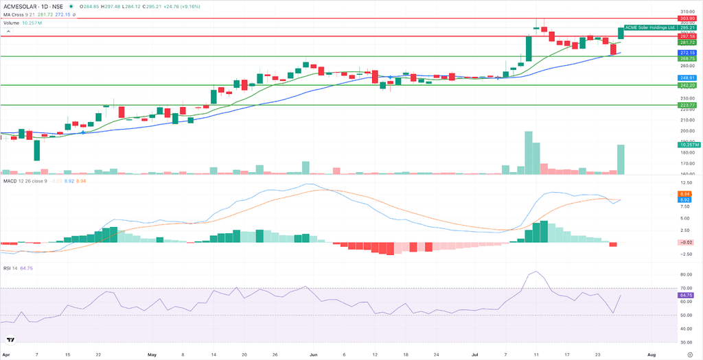 Technical momentum is firmly on the bullish side, with key indicators signaling strength and supporting the breakout. What makes this move particularly significant is that the stock is trading near its IPO issue price, reinforcing confidence in its fundamentals. The breakout has propelled ACME Solar to a new all-time high, making it a stock to watch in the coming sessions.
