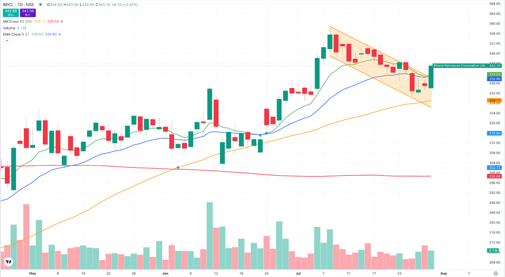 Bharat Petroleum Corporation Ltd. (CMP: ₹343 | Stop Loss: ₹315) also saw a 2% rise today, breaking out from a parallel channel formation on the charts. The stock witnessed a golden crossover between the 9-day and 21-day exponential moving averages, a bullish technical event that often precedes sustained price gains. With technical momentum building, BPCL appears set for a strong move, and investors will be closely watching its performance in upcoming sessions.