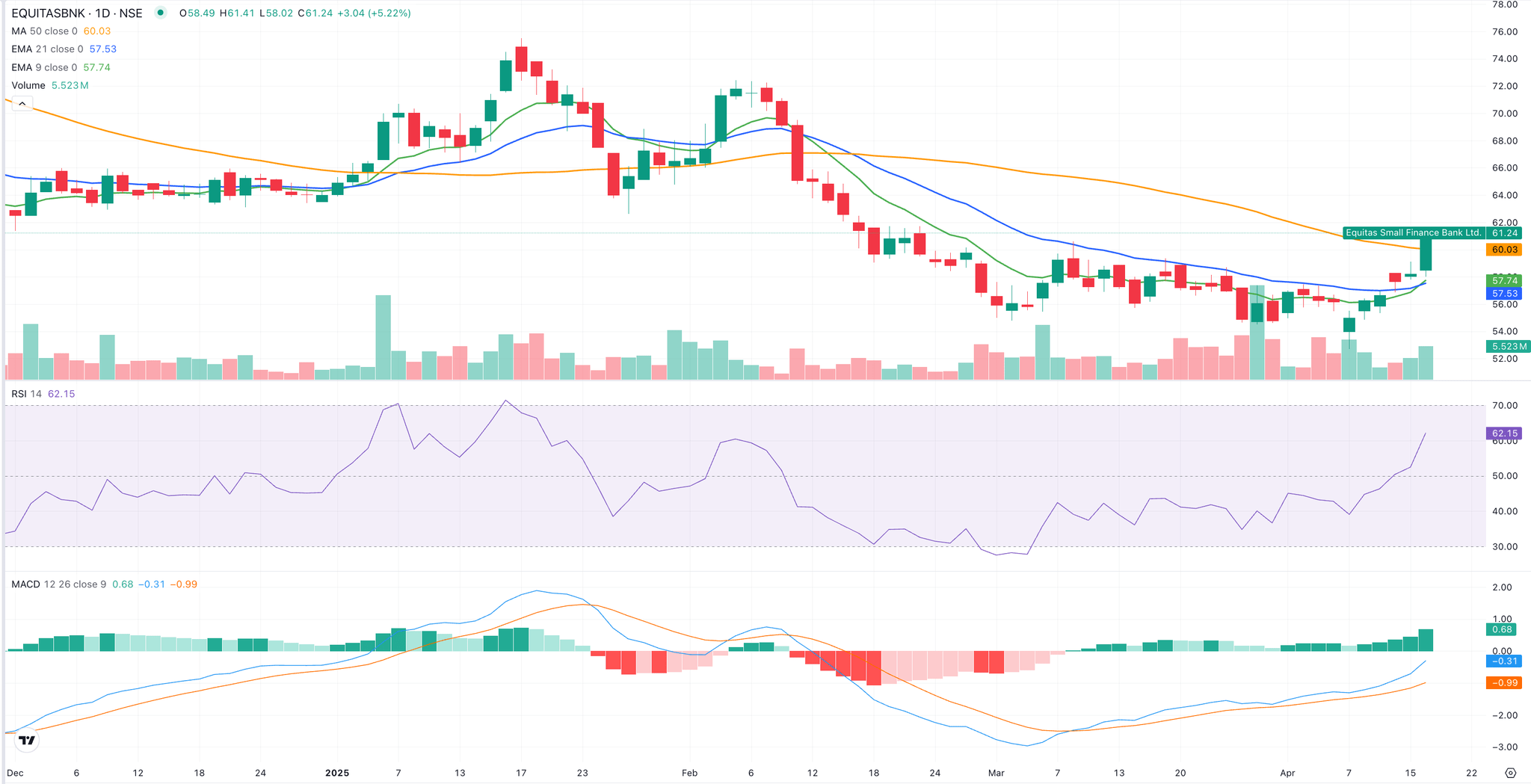 Meanwhile, Equitas Small Finance Bank Ltd. (CMP: ₹60) also rose 4%, attempting to breach resistance at its 50-day moving average. The stock appears to be coming out of a consolidation phase, with both RSI and MACD showing rising momentum—a sign that the stock may be on the verge of a technical breakout.