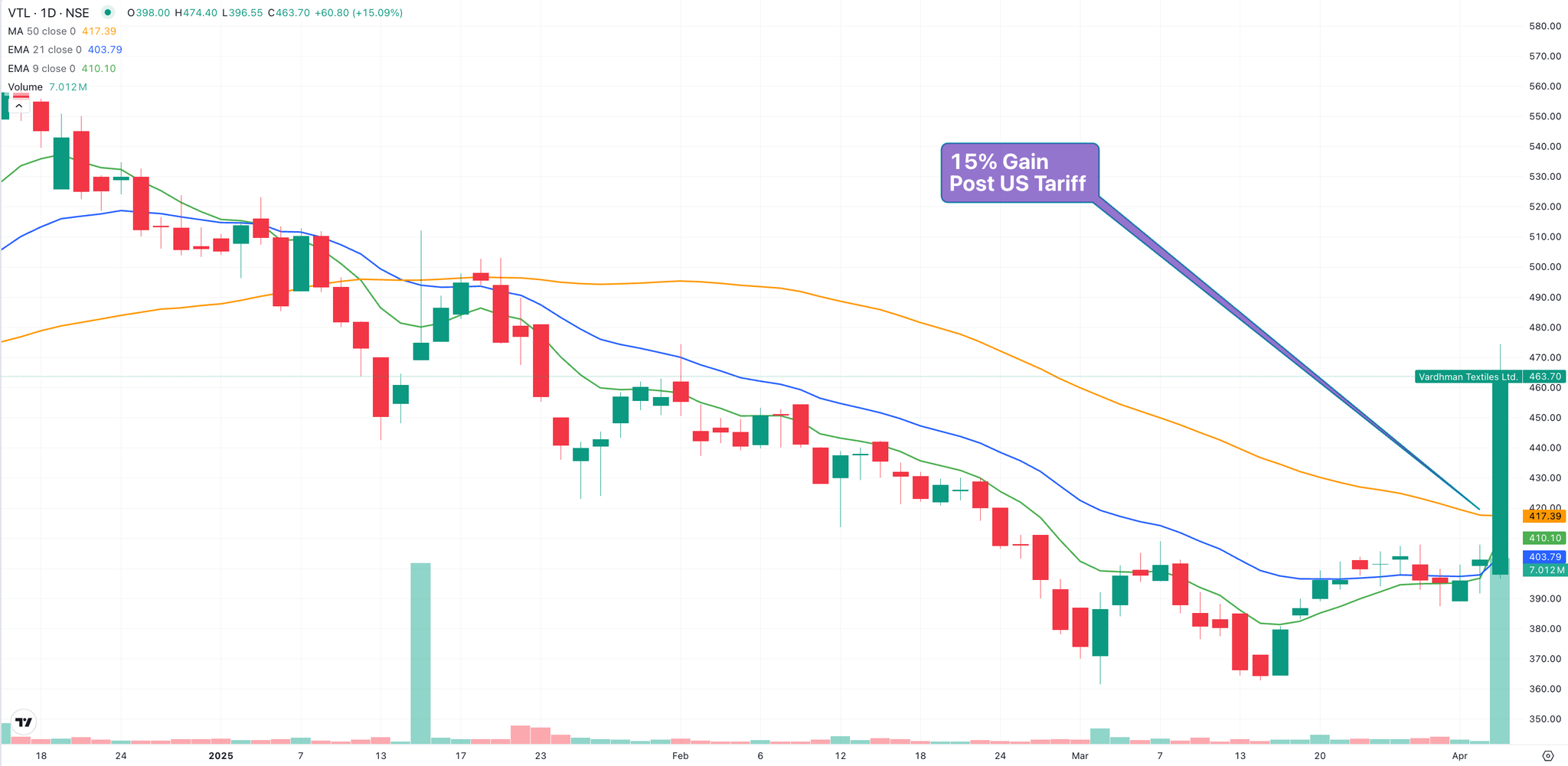 Vardhman Textiles, a global textile conglomerate exporting to 75 countries, surged 15% in today’s trading session. The rally comes as Donald Trump’s 26% reciprocal tariff on Indian textiles is significantly lower than those imposed on competitors such as Bangladesh (37%), Vietnam (46%), and Cambodia (49%). This gives Indian exporters a competitive advantage in the U.S. market.