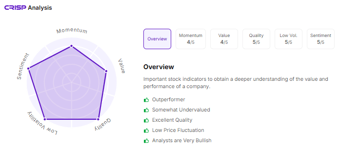 At 11:50 AM, its shares were trading at ₹1428.60 apiece, up 4.61%. Let’s take a look at its CRISP Analysis: