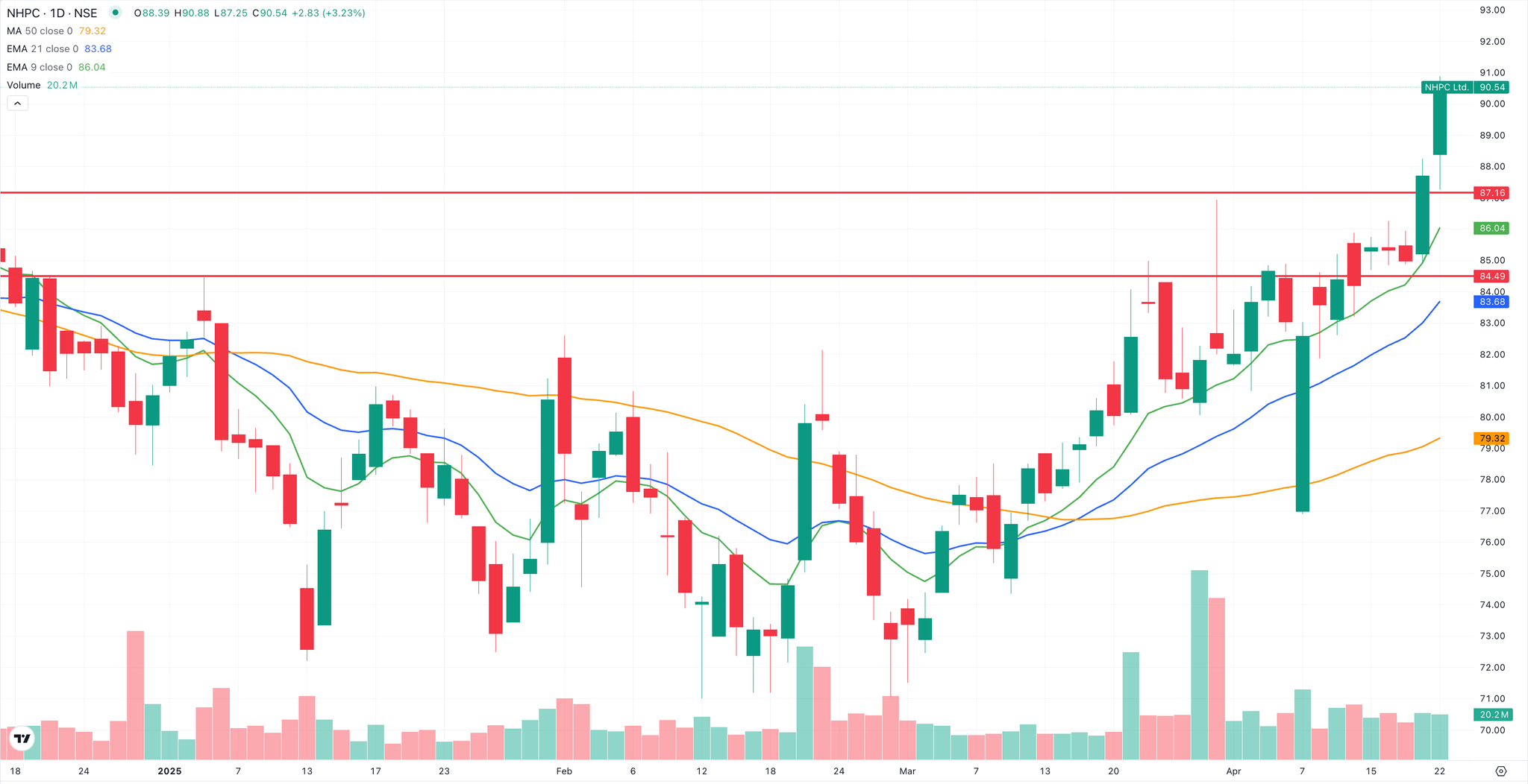 Meanwhile, NHPC Ltd, India’s leading hydroelectric power generator, also saw a 5% jump. The stock is currently trading above key moving averages, and technical analysts are watching the potential formation of a ‘Three White Soldiers’ pattern—a strong bullish signal. With NHPC’s consistent performance and momentum, investors are eyeing a possible breakout if the rally sustains in the coming sessions.
