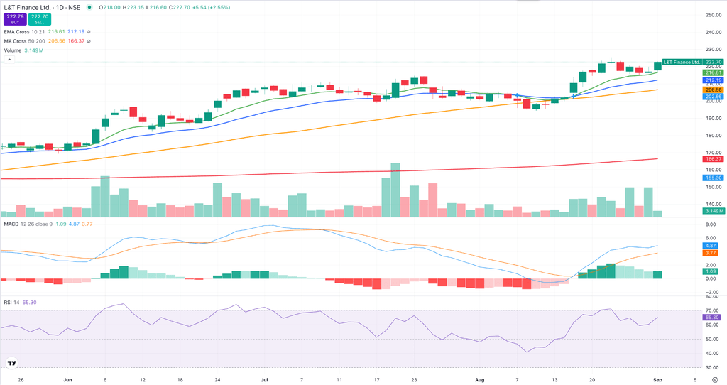 L&T Finance Ltd. (CMP: ₹222, Stop Loss: ₹200) is extending its uptrend, hitting a fresh 52-week high and staying aligned with its short-term moving averages. Both MACD and RSI are in bullish zones, reflecting underlying strength in momentum.