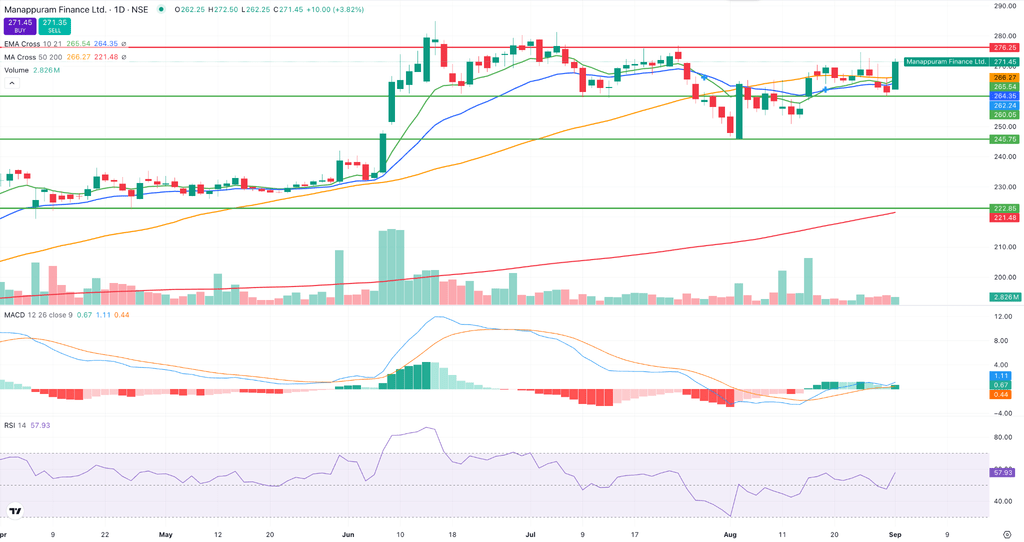 Manappuram Finance Ltd. (CMP: ₹270, Stop Loss: ₹245) surged 4% today, breaking out of a base formation and signaling fresh bullish momentum. The stock has registered a 10–21 day EMA crossover, further strengthening the technical setup. MACD has moved above the signal line, while RSI is trending higher, indicating improving sentiment.