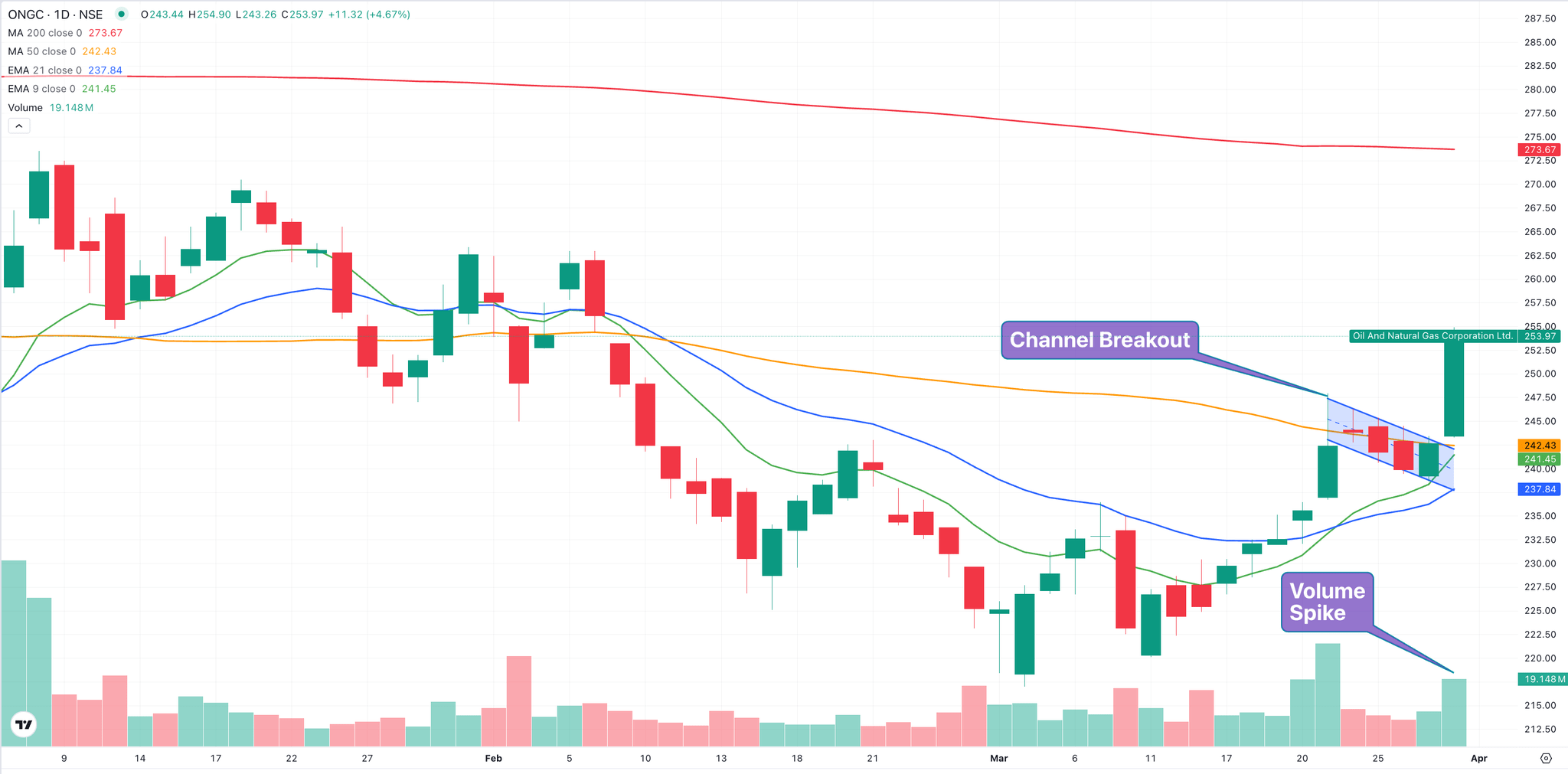 Oil and Natural Gas Corporation (ONGC), India’s largest crude oil and natural gas producer, saw a 4% jump in its stock price today, driven by a strong volume spike. The stock is trading above its 50-day moving average, with the 10-day and 21-day moving averages turning upward, indicating bullish momentum. The recent surge in interest has made ONGC a stock to watch in the coming sessions.