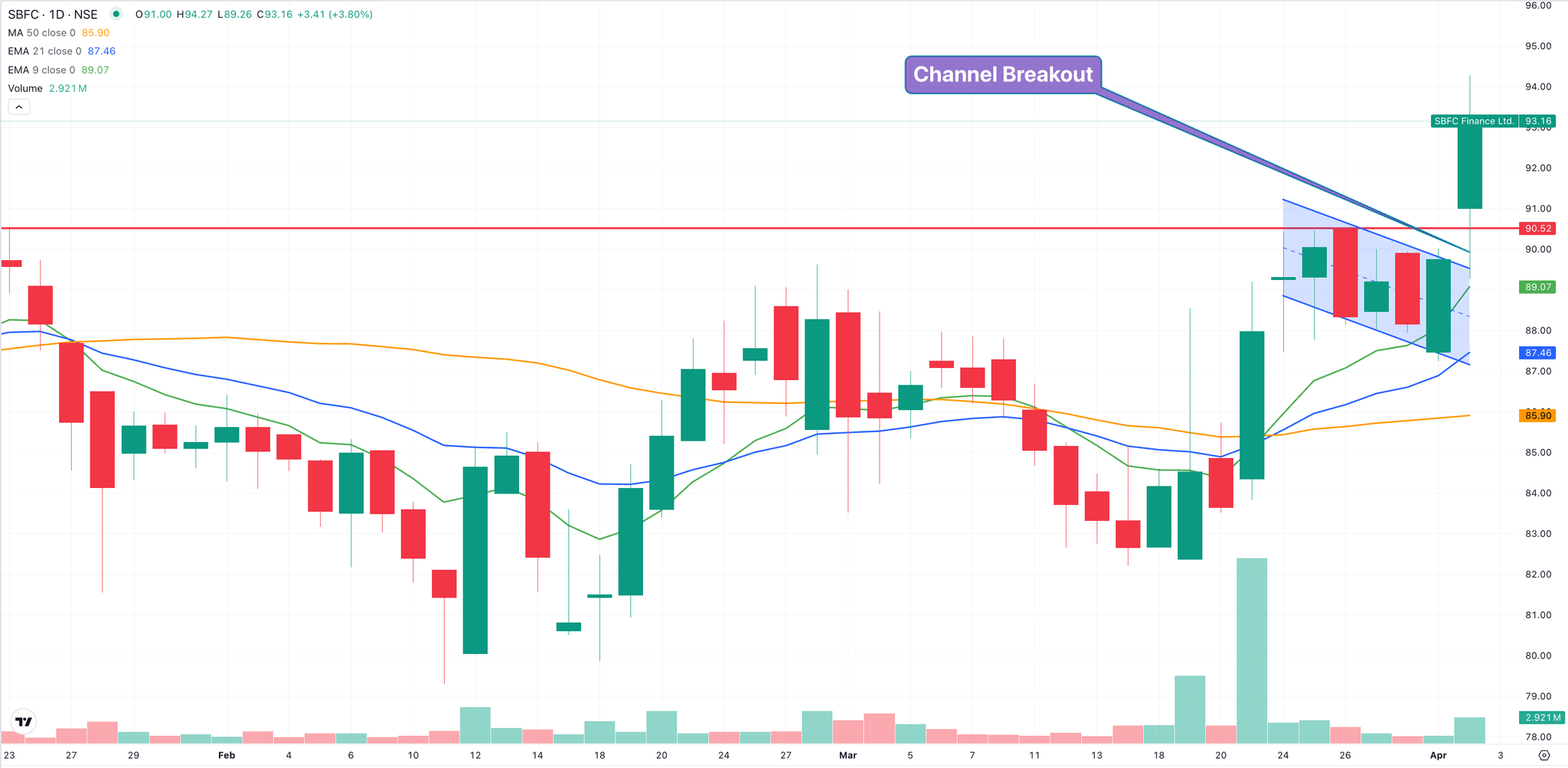 SBFC Finance Ltd., which provides loans to micro-enterprises secured by residential or commercial property, as well as gold loans, unsecured personal loans, and business loans, has seen its stock surge by 3% today. The stock has broken out of its channel, with the 10-day and 21-day moving averages trending upward, signaling potential strength. Additionally, trading above its 50-day moving average confirms the uptrend. Investors will be closely watching its performance in the coming sessions.