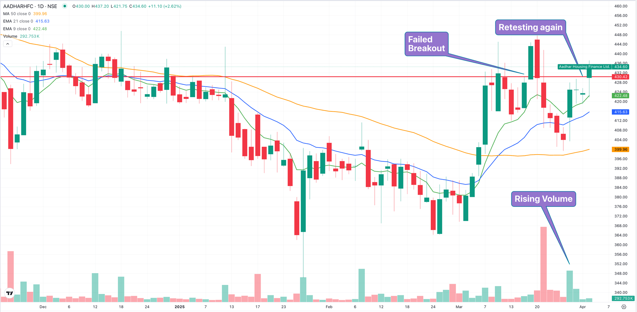 Aadhar Housing Finance, a key player in the housing finance sector, saw its stock rise 2% today. The stock is currently retesting its resistance before a potential breakout. While it experienced a temporary decline, the recent uptrend suggests renewed investor confidence.