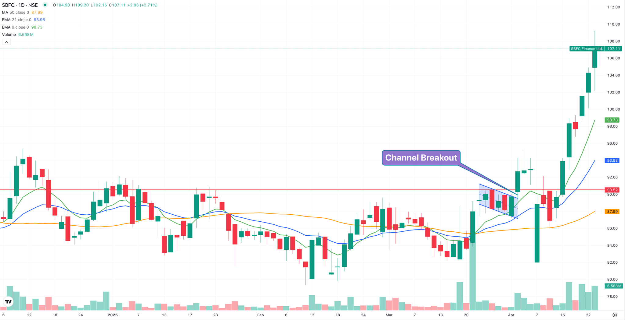 Shares of SBFC Finance Ltd. surged by an impressive 15% in April, driven by strong volume accumulation and positive sentiment in the Banking and Financial Services sector. The stock’s rally comes on the heels of the Reserve Bank of India’s recent rate cut announcement, which has provided a favorable backdrop for financial firms.