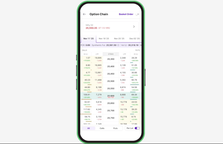 The entire option chain is now your canvas. Build complex strategies like straddles or iron condors by simply tapping your desired strikes—one click per leg is all it takes to add them to your basket.