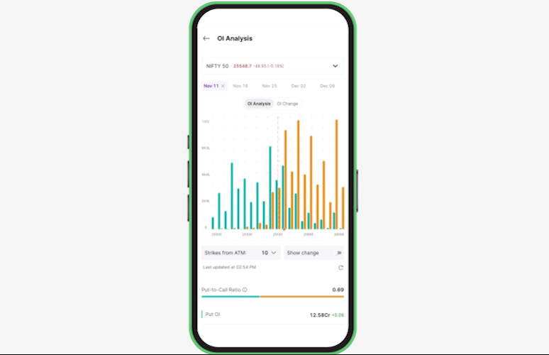 Visually analyze put and call OI, and the change in OI, over any duration for all F&O stocks and indices.