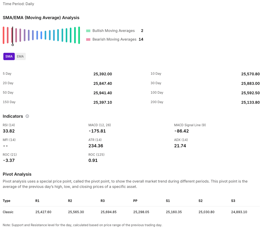 Nifty 50 ended the week on a bearish note, losing approximately –2.40% (-616 points), closing at 25,694.
