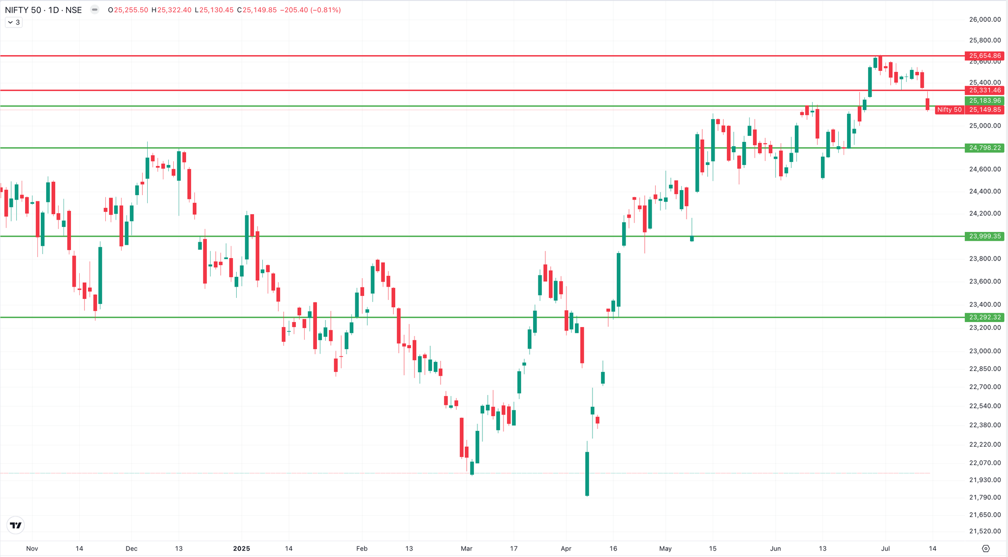 The Nifty 50 ended the week in negative territory, falling by 303 points to close at 25,149. The index broke below its key support level of 25,183, indicating growing bearish sentiment. This marks the third consecutive session of market decline. Looking ahead, the Nifty 50 has crucial support at 24,800, while resistance is expected near the 25,330 level.