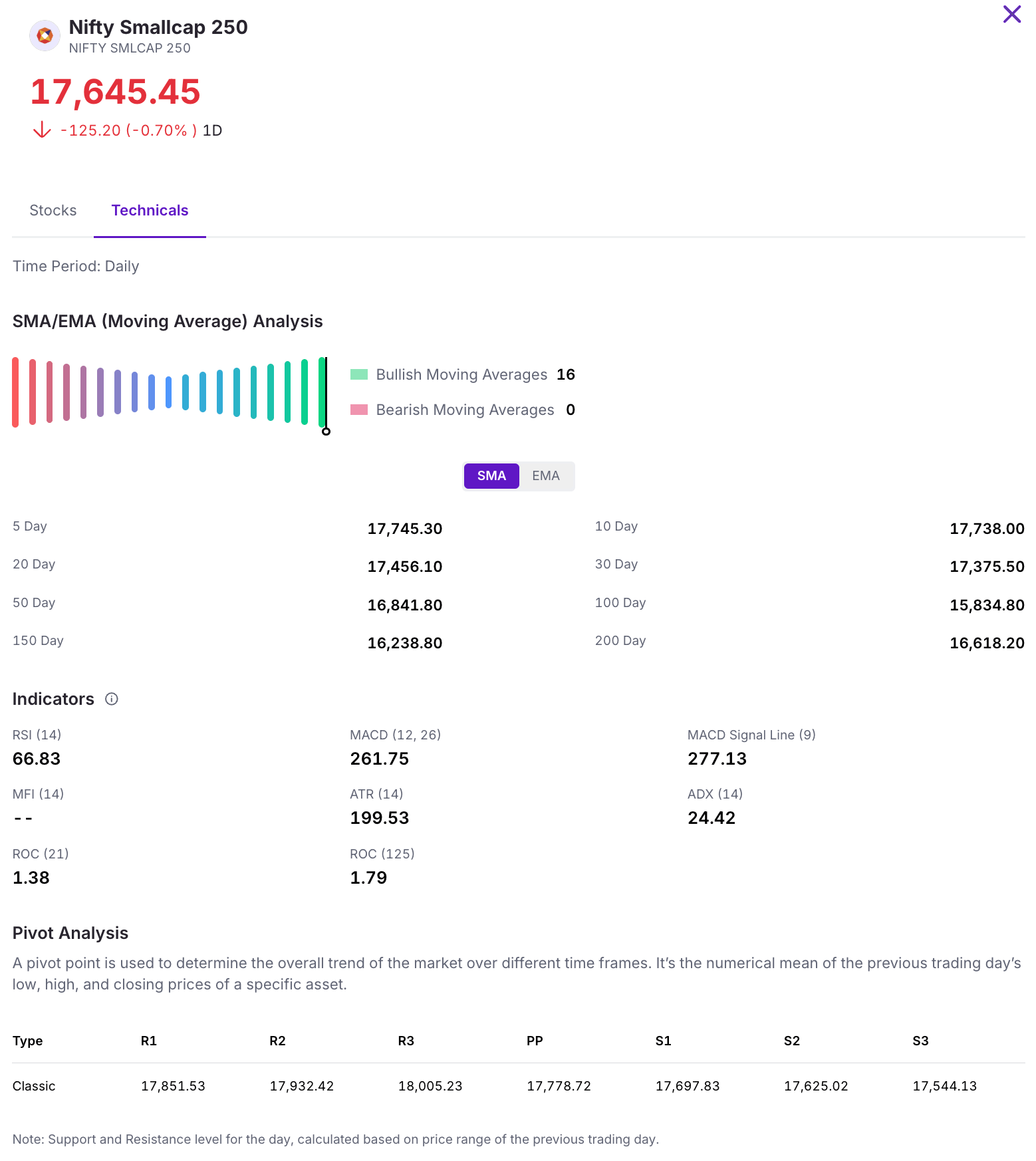 | Nifty Smallcap 250 | 17,645.45 (- 0.70%) |