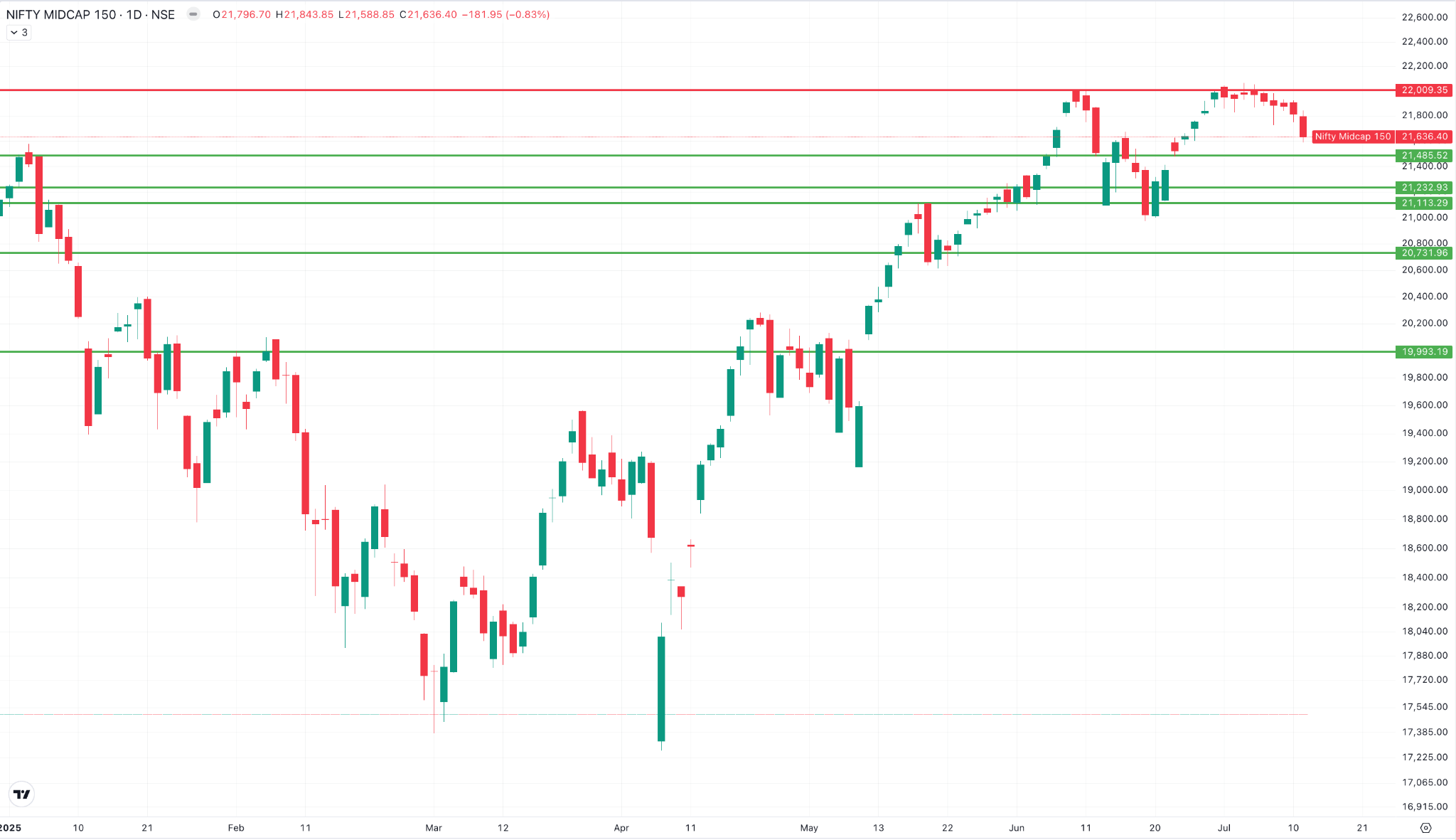 The Nifty Midcap 150 closed in the red this week, declining by approximately 303.75 points to settle at 21,636 on Friday. Looking ahead, strong support is expected at 21,400, while resistance is at 22,000 levels, which is being tested again.