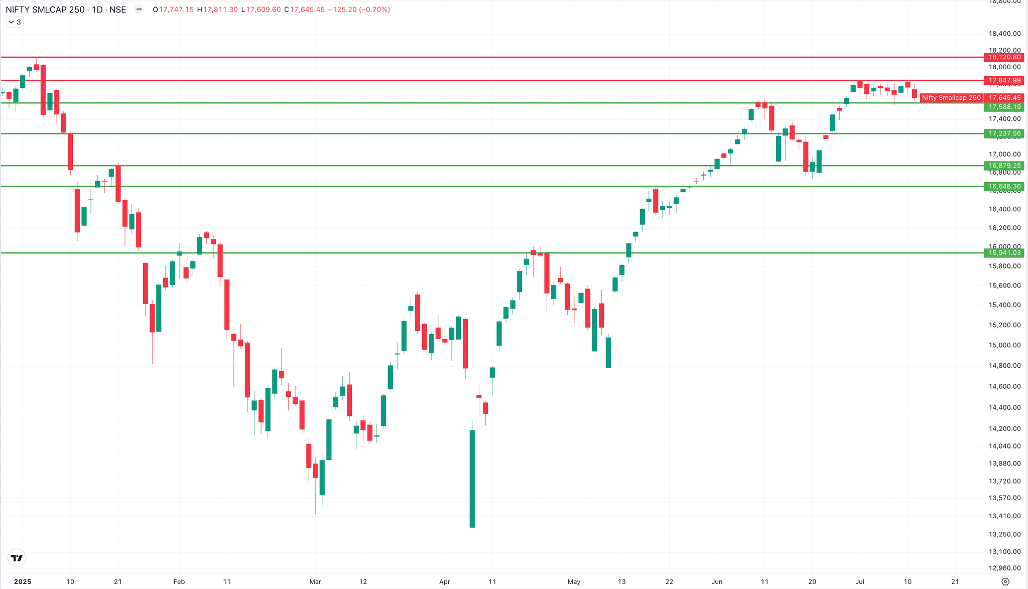 The Nifty Smallcap index ended the week on a flat note, closing at 17,645. The index continues to find strong support around the 17,500 level, while immediate resistance is expected in the 17,800 to 18,000 range.