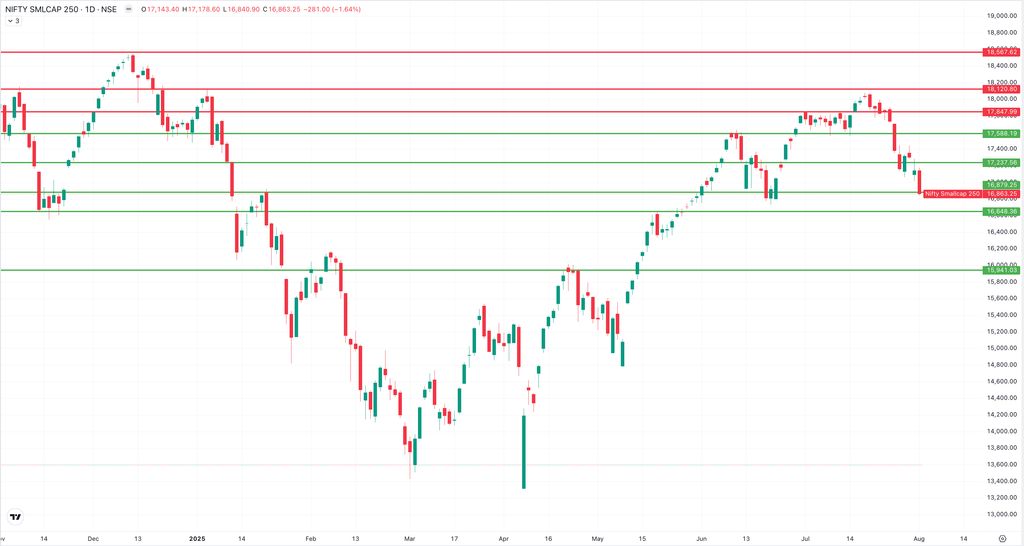 The Nifty Smallcap 250 index declined by 5.54% this week, falling 989.65 points to close at 16,863.25 on Friday, August 1. Although the index exhibited a sharp decline throughout the week, it lost significant ground on Friday alone, dropping around 1.64% in a single day. This reflects bearish sentiment and overall market weakness.