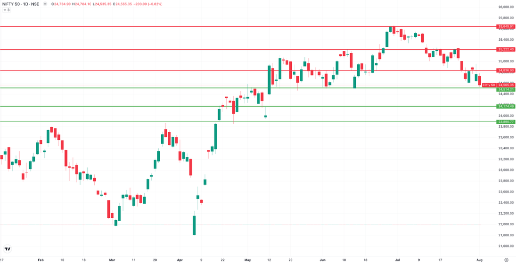 The Nifty 50 index declined by 2.6% this week, falling 654.55 points to close at 24,565.35 on Friday. The index failed to hold its key support level at 24,800, indicating bearish sentiment and overall market weakness. Looking ahead, the next critical support zone lies near 24,000–24,200, which could act as a potential cushion if the downtrend continues.