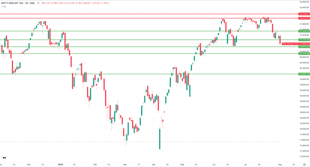 The Nifty Midcap 150 index declined by 3.92% this week, falling 860.60 points to close at 21,088.65 on Friday, August 1. While the index fell sharply over the week, it lost significant ground on Friday alone, dropping about 1.28% for the day. This indicates bearish sentiment and overall market weakness.