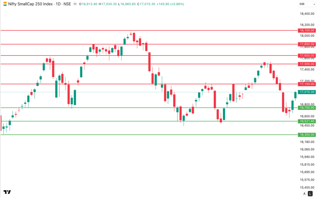The Nifty Smallcap 250 gained about 1.99% this week, ending at 17,015.30 on Friday. A breakout above 17,150 or a breakdown below 16,750 will be key to determining the next leg of its momentum.