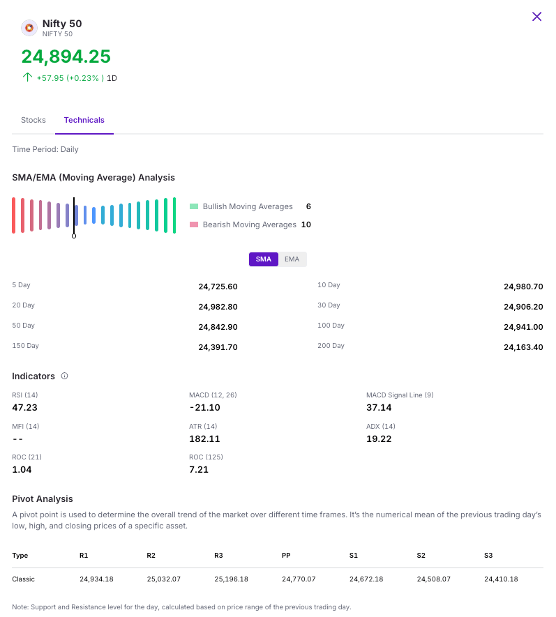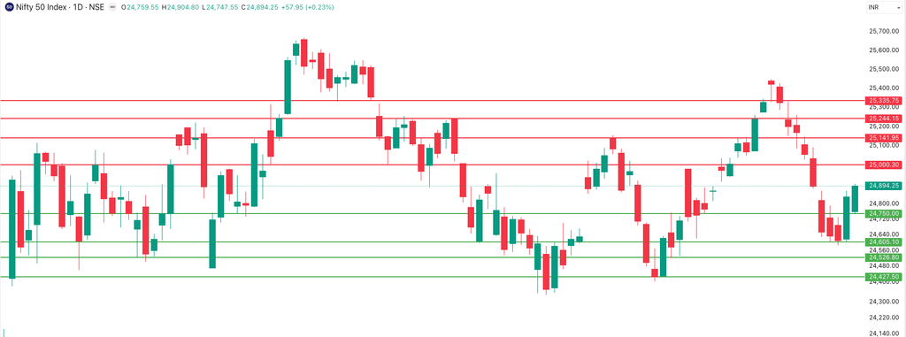 The Nifty 50 gained 0.9% this week, breaching the key 24,800 level and closing above its 50-day SMAs. The rally was primarily led by gains in metal, and banking stocks.the next nearest resistance at 25,000 and support is at around 24,750
