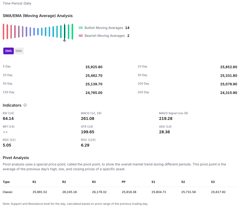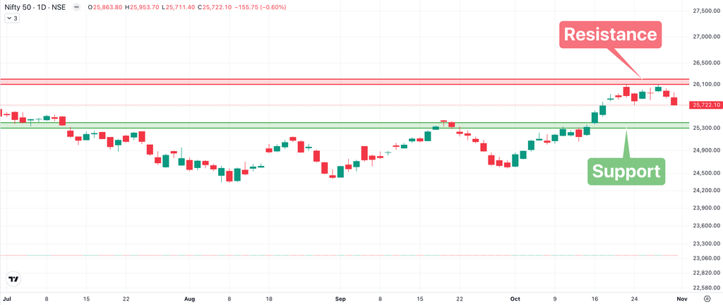 The Nifty 50 paused this week, falling 0.57% to close at 25,722.10. The index lost 146 points on Friday alone.