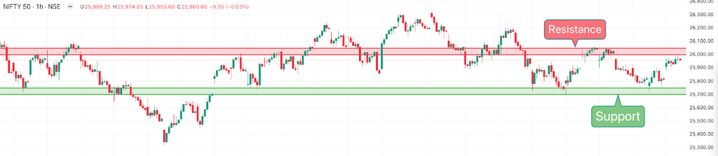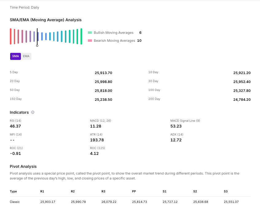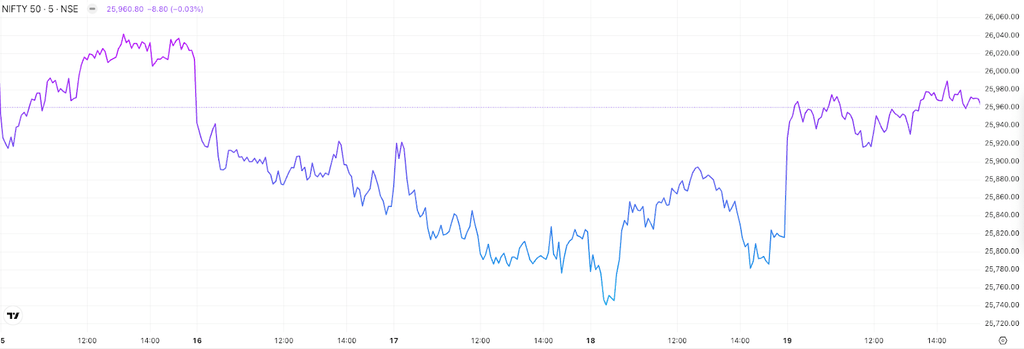 The Nifty 50 recorded a slight decline of 0.31% on a weekly closing basis. The index ended at 25,966.40, reflecting a marginal loss of just 80.55 points. Throughout the week, the Nifty remained in a phase of consolidation