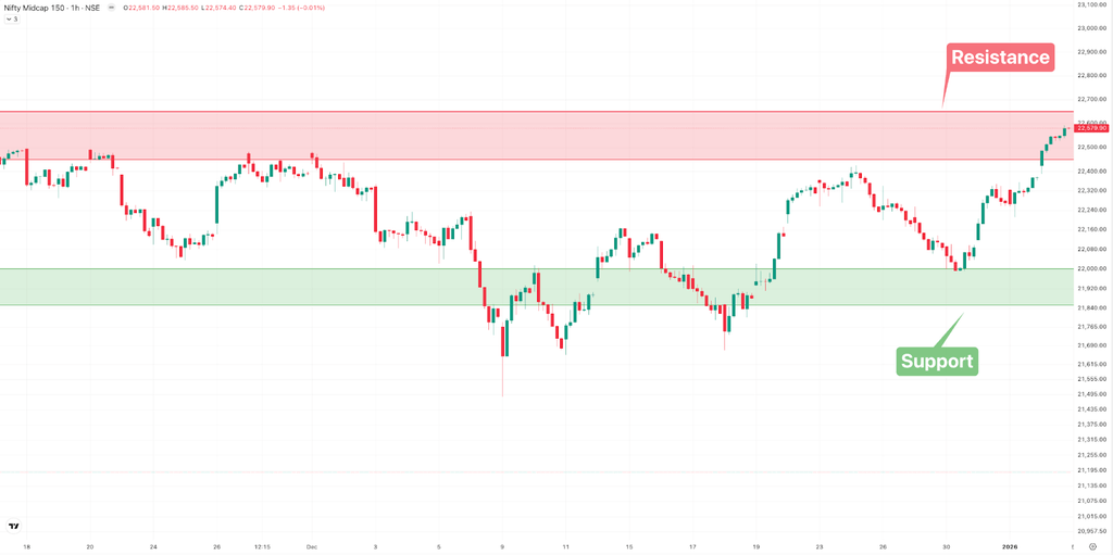 The Nifty Midcap 150 index closed at 22,579.05 marking a gain of 331 points from the previous week’s close. For the upcoming sessions: