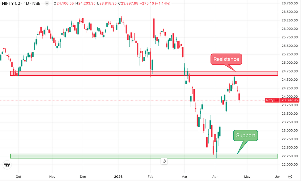 The Nifty 50 ended the week down by -1.84%, losing approximately -455.60 points to close at 23,897.95.
