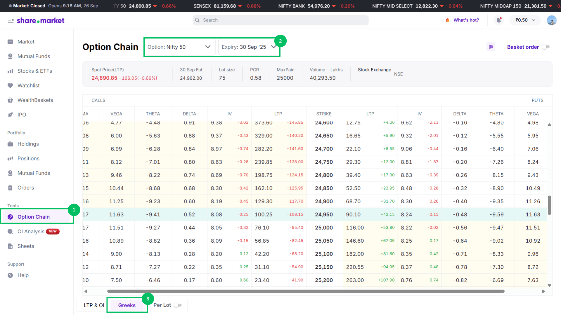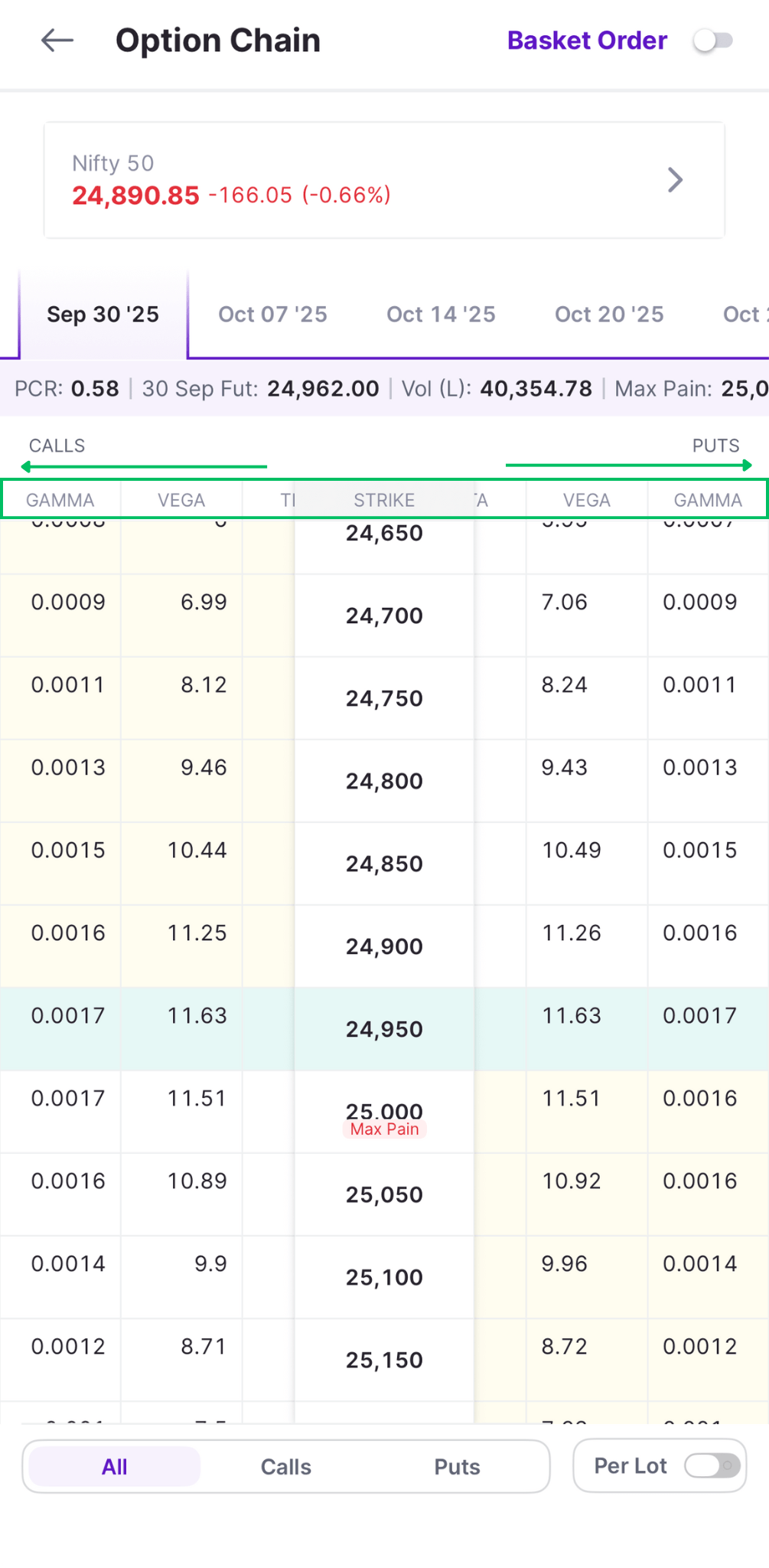 You can easily view Option Greeks—Delta, Gamma, Theta, Vega, and Rho—for your option contracts on both our Web platform and Mobile App.