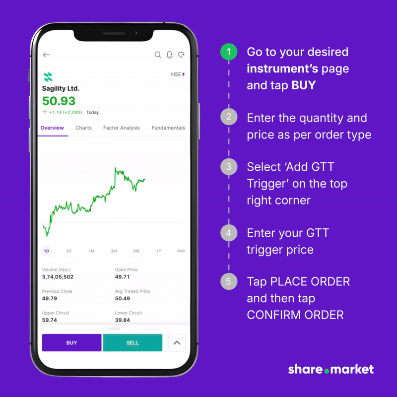 Once you’ve filled in all the requirements on the order details screen like the product type, order type, trigger price, and quantity, you place a GTT order by toggling the GTT button as per the steps below.